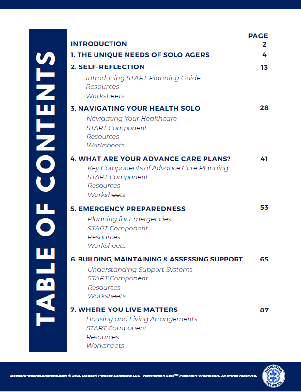 Designed specifically for solo agers, this 150+ page workbook walks you step-by-step through the essential aspects of solo aging - from healthcare planning and legal preparedness to community engagement, financial awareness, and personal well-being.