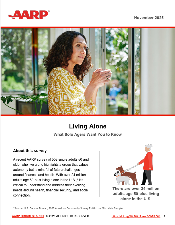 AARP’s Living Alone: What Solo Agers Want You to Know study finds that many Americans age 50 and older who live alone without a partner or children report high levels of satisfaction, autonomy, and social engagement, while also expressing concerns about loneliness, future health declines, and financial security as they age